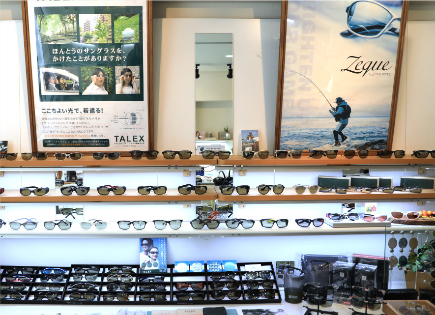 当店では、島根県内では3店舗のみの取扱いである偏光レンズメーカーTALEX社のサングラスを販売しております。登山や釣りをされる方など男女問わず、人気のあるブランドです。また、眼鏡の発祥地である福井県鯖江市産の眼鏡も多数取り揃えており、国産の眼鏡に力を入れております。